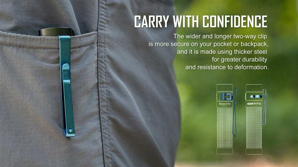 The Baton 3 Pro maintains the same dimensions as its predecessor at 3.99'' long and only 3.63 ounces so it fits comfortably in any pocket or bag. Use the dual-direction pocket clip to secure the light during travel or for hands-free options. Impact resistant and rated IPx8 waterproof, everywhere is a possibility with this everyday carry flashlight.