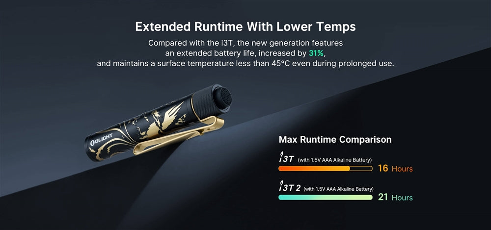 The Olight i3T 2 brings a highly-anticipated upgrade from its predecessor, the original i3T, featuring a brighter beam, extended throw distance, and longer runtime—all within the same compact size. With a maximum output of 200 lumens and a throw of up to 68 yards, the i3T 2 offers two modes, Mode 1 (200 lumens) and Mode 2 (5 lumens), easily toggled with its two-stage tail switch.