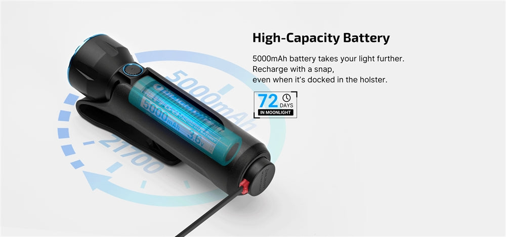 Equipped with a powerful rechargeable battery, the Olight Javelot offers an impressive 72 days of runtime on its lowest setting. Easily monitor the battery level thanks to the built-in indicator on the side switch button, ensuring you always know when it's time to recharge. Charging the flashlight is simple with the magnetic cable; just snap it to the bottom of the light, even when the light is inside the holster.