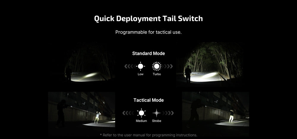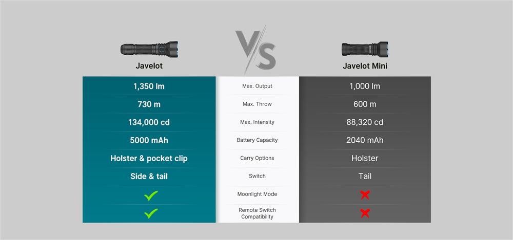The Olight Javelot is a powerful and portable EDC flashlight capable of throwing light up to 798 yards with a brightness of up to 1350 lumens. It features a metal side switch and a two-stage tactical tail switch, providing access to five different brightness modes and a Strobe mode. Depending on your lighting needs, the Javelot can be programmed into either Standard or Tactical mode. In Standard mode, you can quickly switch between Low and Turbo brightness modes by pressing the tail switch. In Tactical mode, you can switch between Medium and Strobe with the tail switch. Use the side switch to cycle through other brightness settings. The Javelot can also memorize your last selected brightness mode and includes a Lockout mode to prevent accidental activation.