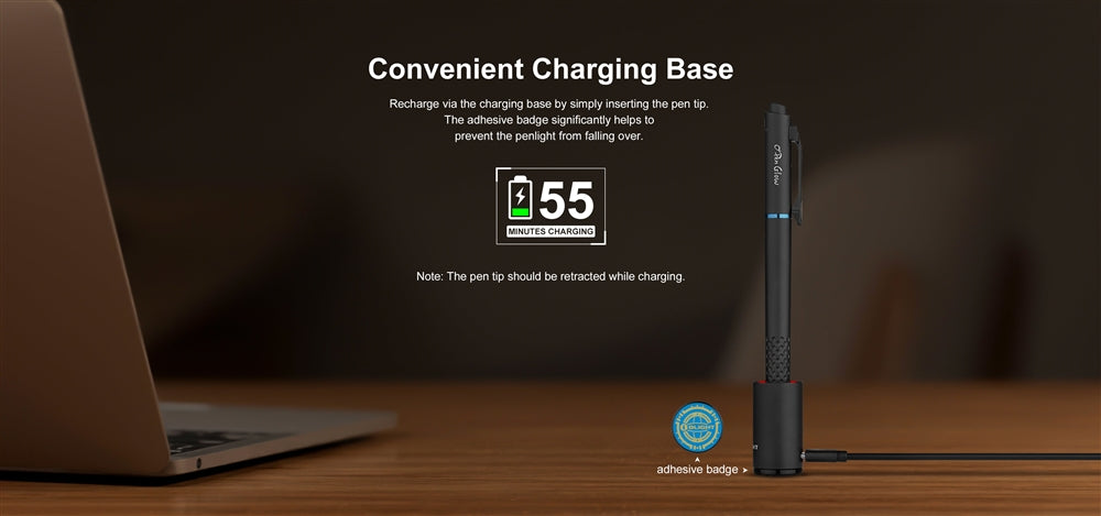 The O’Pen Glow can provide up to 120 lumens of light and run for up to 6 hours. You can easily adjust brightness at 5 levels from 0.2 lumens to 120 lumens. The O’Pen Glow comes with a convenient USB-C charging base so that you can fully charge your pen in less than an hour, ensuring minimal downtime. A power indicator on the charging base keeps you informed about the battery status, while the lockout mode on the pen prevents accidental activation. The O’Pen Glow is well suited for everyday carry during presentations, patrols, job sites, or anywhere else.