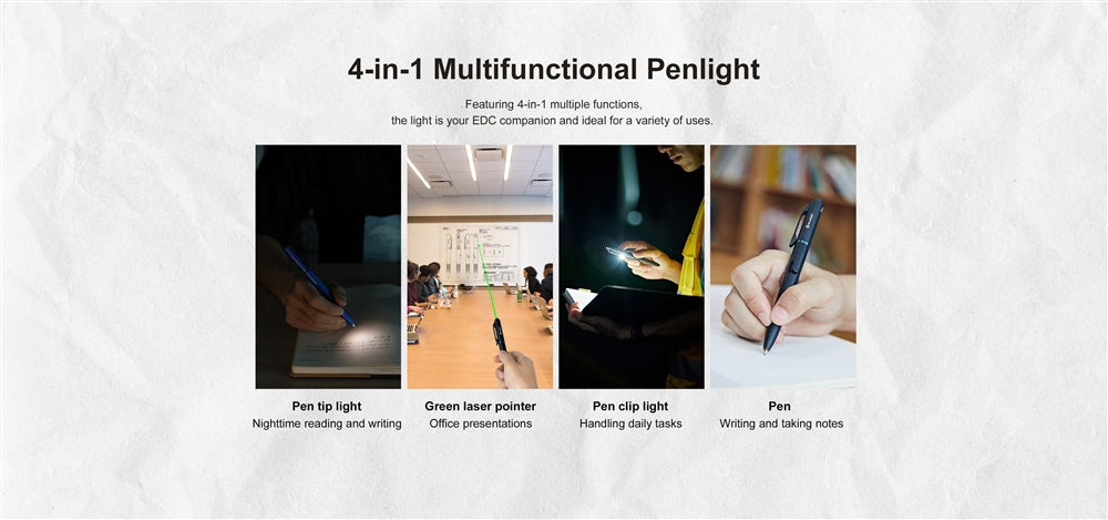 The Olight O’Pen Glow is a sleek 4-in-1 EDC pen. With a pen, a flashlight, a pen tip light, and a green pointer beam at the tail, this pen offers a versatile function to enhance your writing expense. Crafted from durable aluminum alloy, this pen is the perfect balance between sturdiness and weight. With a comfortable grip and non-slip design, it's perfect for extended writing sessions. Two ink refills are included for uninterrupted productivity.