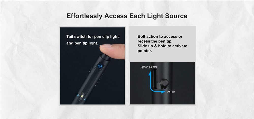 Effortlessly control all the O’Pen Glow's features with the user-friendly L-type bolt action switch. Activate the retractable pen tip, control the flashlight and pen tip light, or engage the green laser pointer for presentation or marking. Alternatively, you can also use the tail switch to control the pen clip light and pen tip light. You can also split the pen into two parts: the top part can be used as a penlight while the bottom part as a pen, allowing you to tailor the lighting experience to your writing needs.