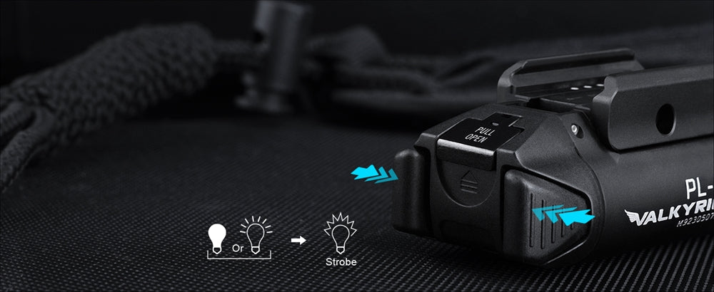 The Olight PL-3S Valkyrie is a highly compact and rechargeable WML flashlight with an adjustable sliding block. With a maximum output of 1000 lumens and a throw of 219 yards, this PL-3S can help illuminate any situation. Switch between the High and Low modes by double-pressing either of the switches or press and hold the switch to momentarily turn the light on. To access Strobe mode, simply press both switches at the same time.