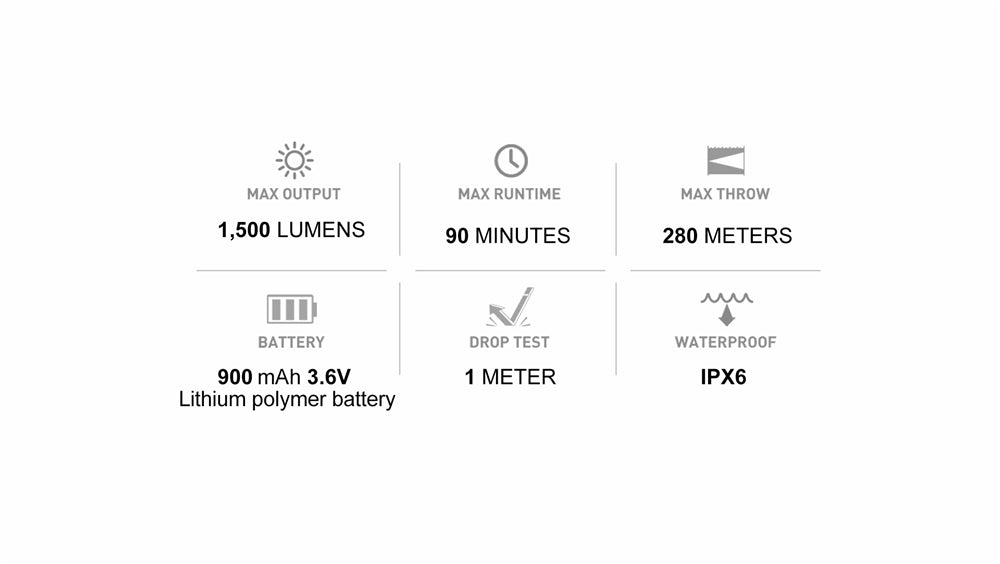 Mode 1 | 1500 ~ 600 lumens | 1.5 + 45 min |