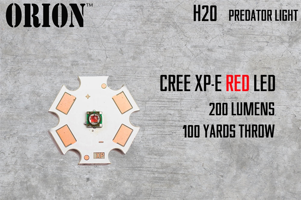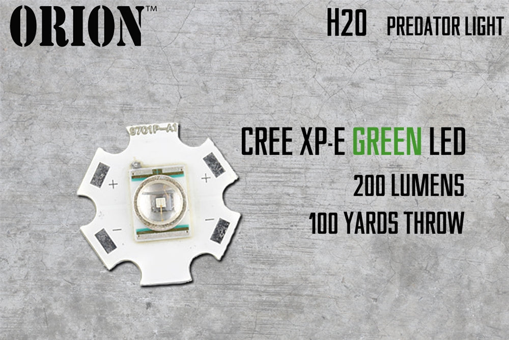 The Orion H20 is a pure color flashlight designed especially for predator and night hunting. Equipped with a CREE XR-E LED in your choice of red or green, the H20 emits up to 200 lumens of light with a throw distance of 100 yards.