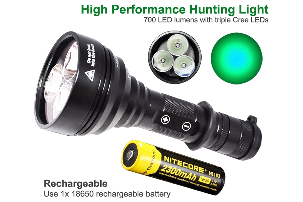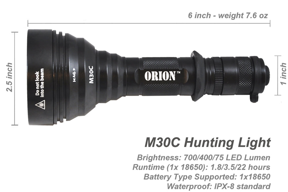 At 700 lumens, the Orion M30C is the brightest predator light available. Each light is equipped with three CREE XP-E2 color LEDs. Choose between red or green 100% pure light with no loss from filtering.
