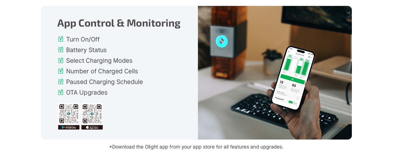 The Ostation X offers two charging modes: Fast and Standard. In Fast Charging mode, it can fully charge up to four batteries in just 2.5 hours, while Standard mode takes 3.8 hours. To monitor the charging status and control the device, simply download the Olight app for real-time updates. A built-in color indicator around the power button provides quick visual reminders of its current status.